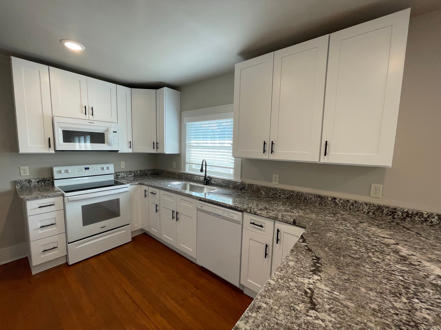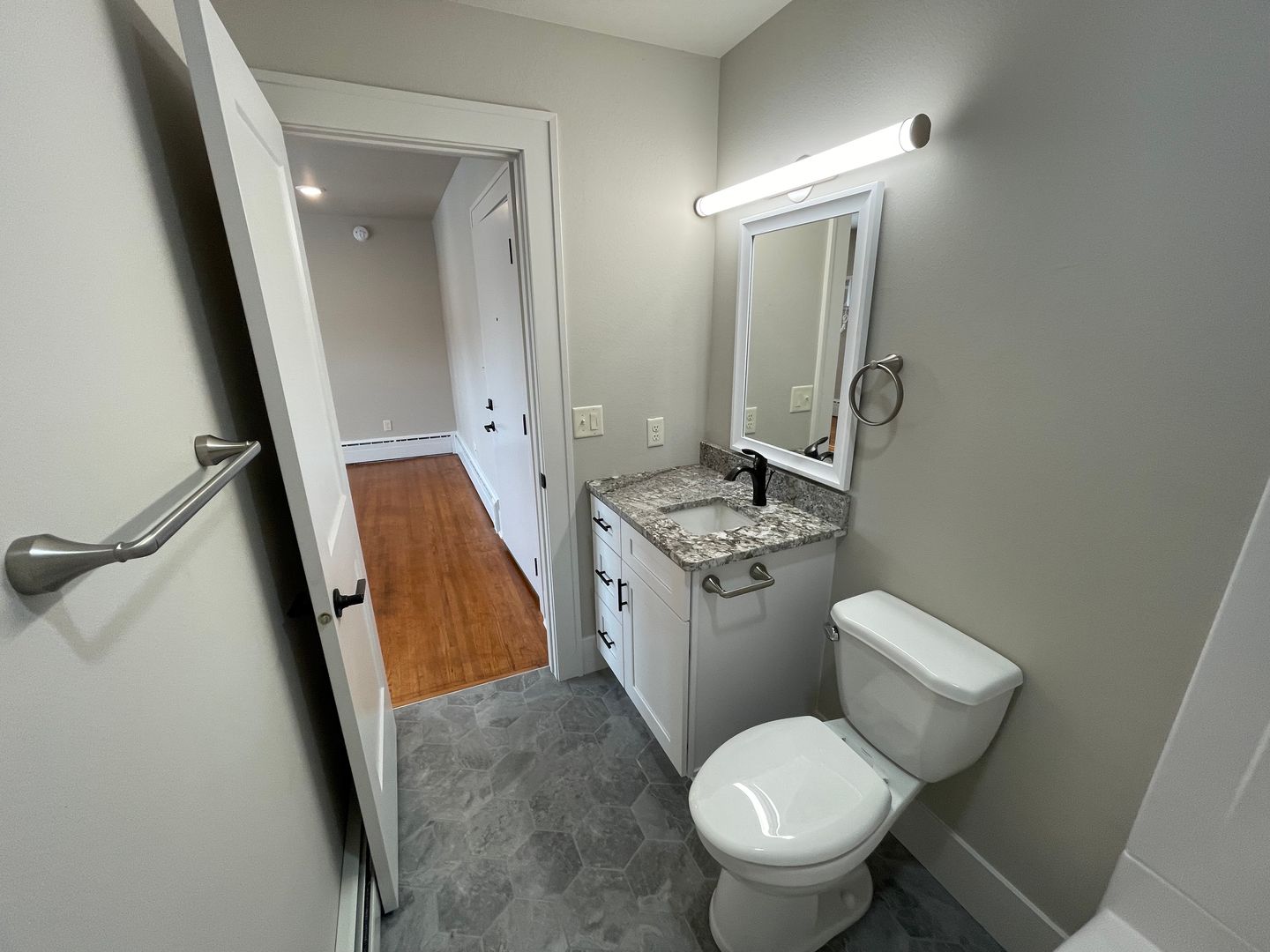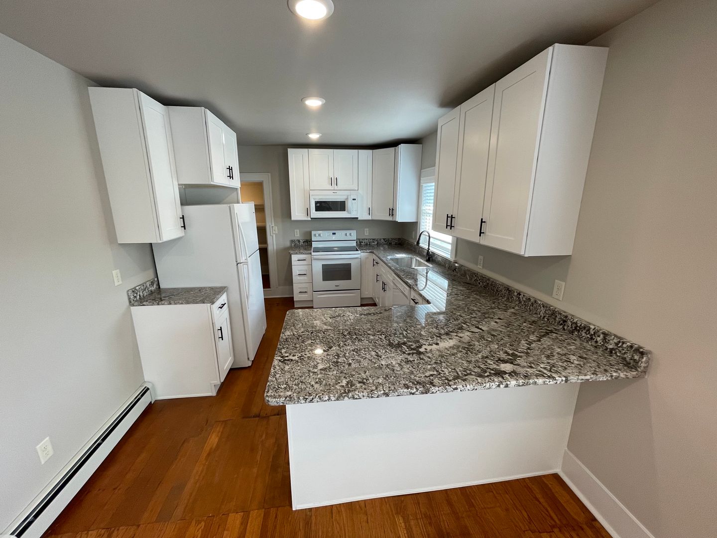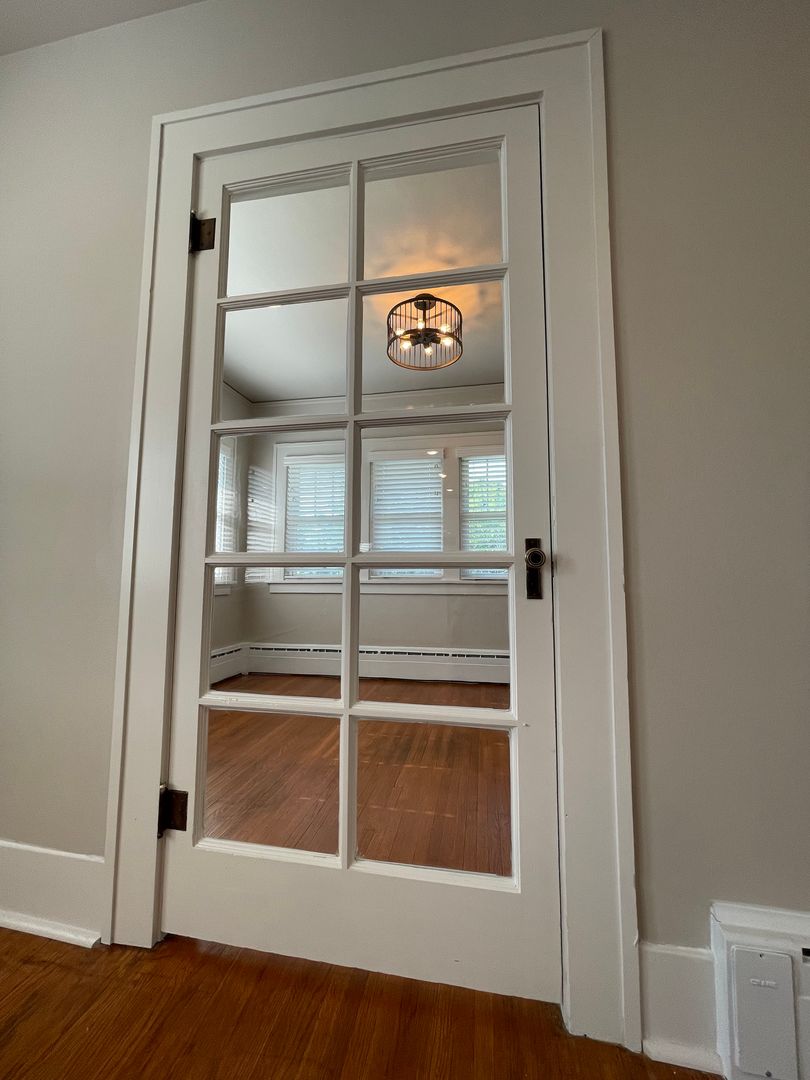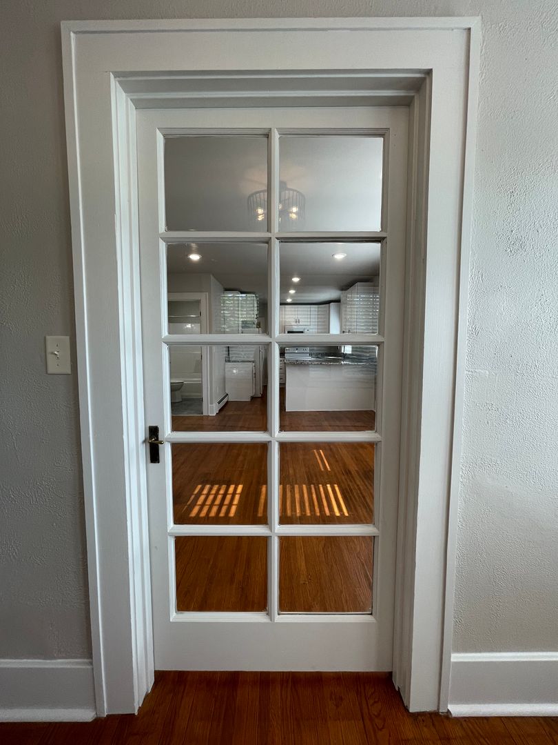 Kitchen is large and the main attraction with gorgeous granite countertops and tons of cabinets and brand new appliances. Original hardwood floors were professionally refinished and are throughout the apartment. Unique hexagon style tile in bathrooms.