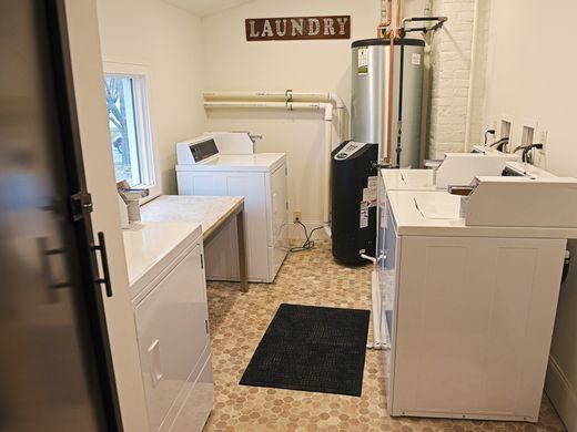 Coin-operated laundry on site. A few shared off-street parking spaces available.