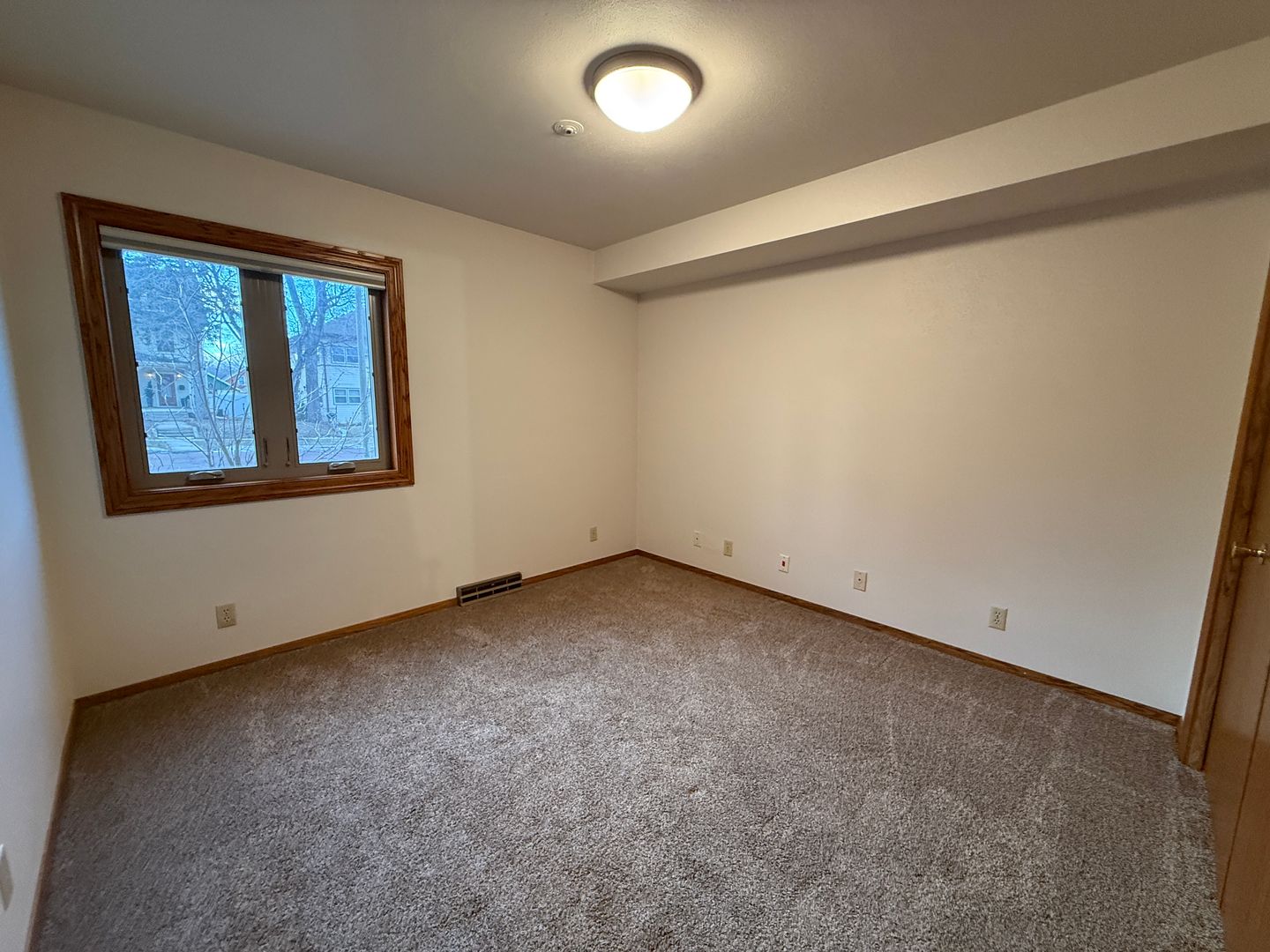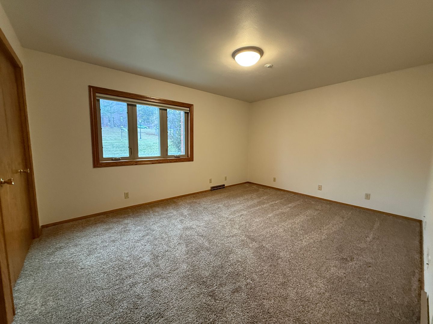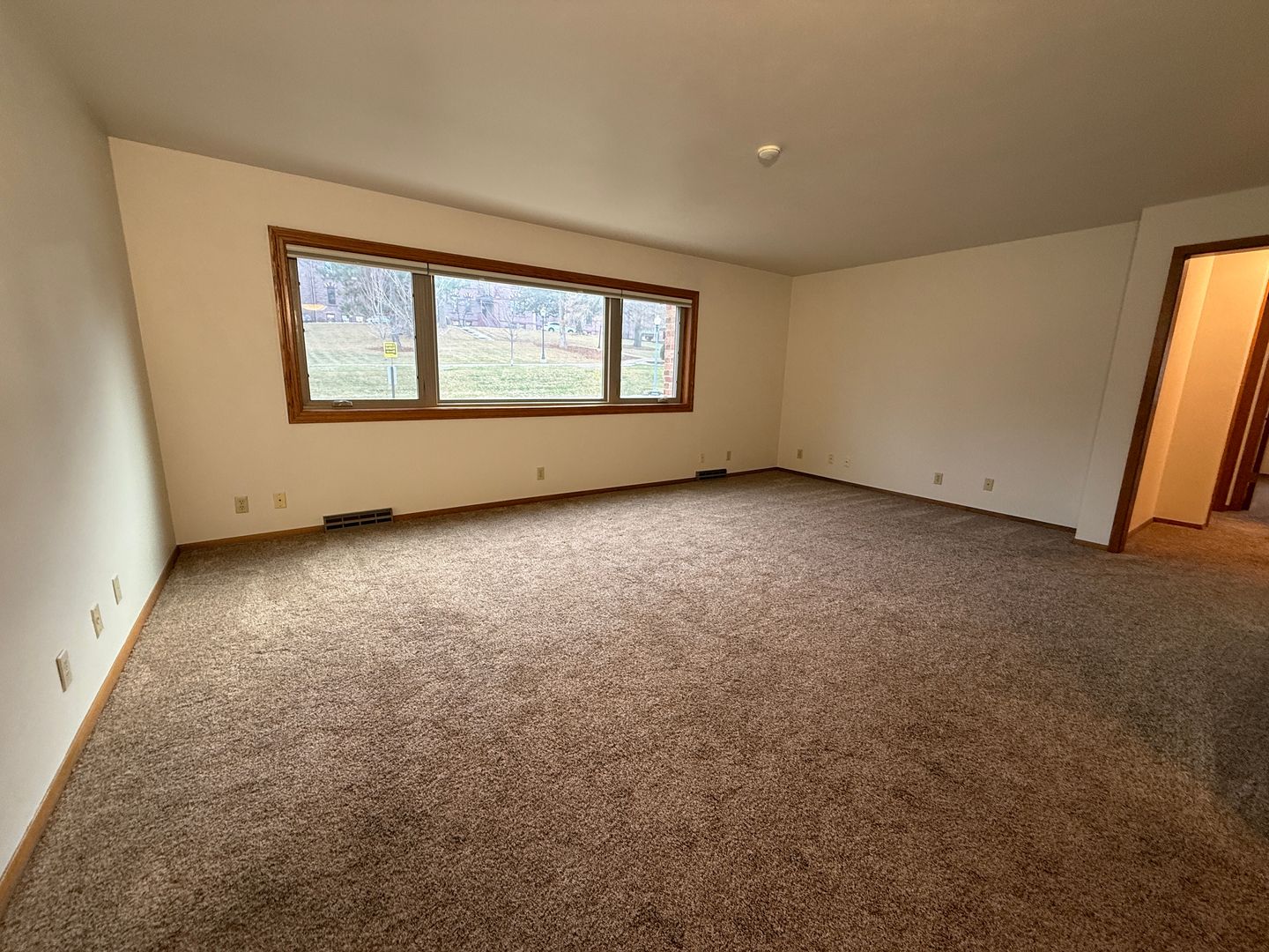 The generous living area features plush carpeting, neutral tones, and a wide window facing south and west that brings in natural light while maintaining privacy—perfect for relaxing or entertaining.