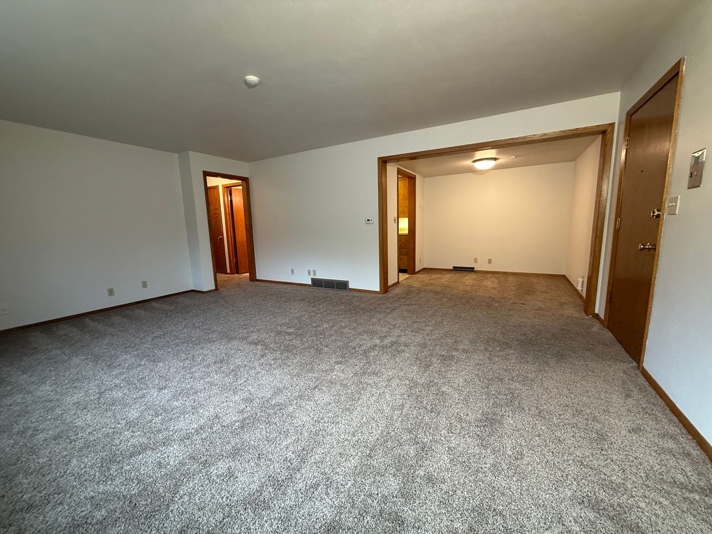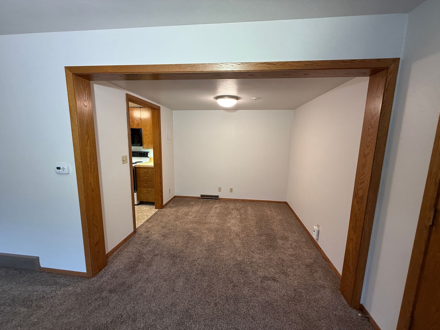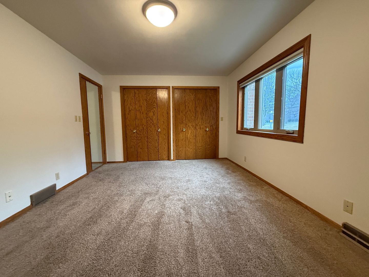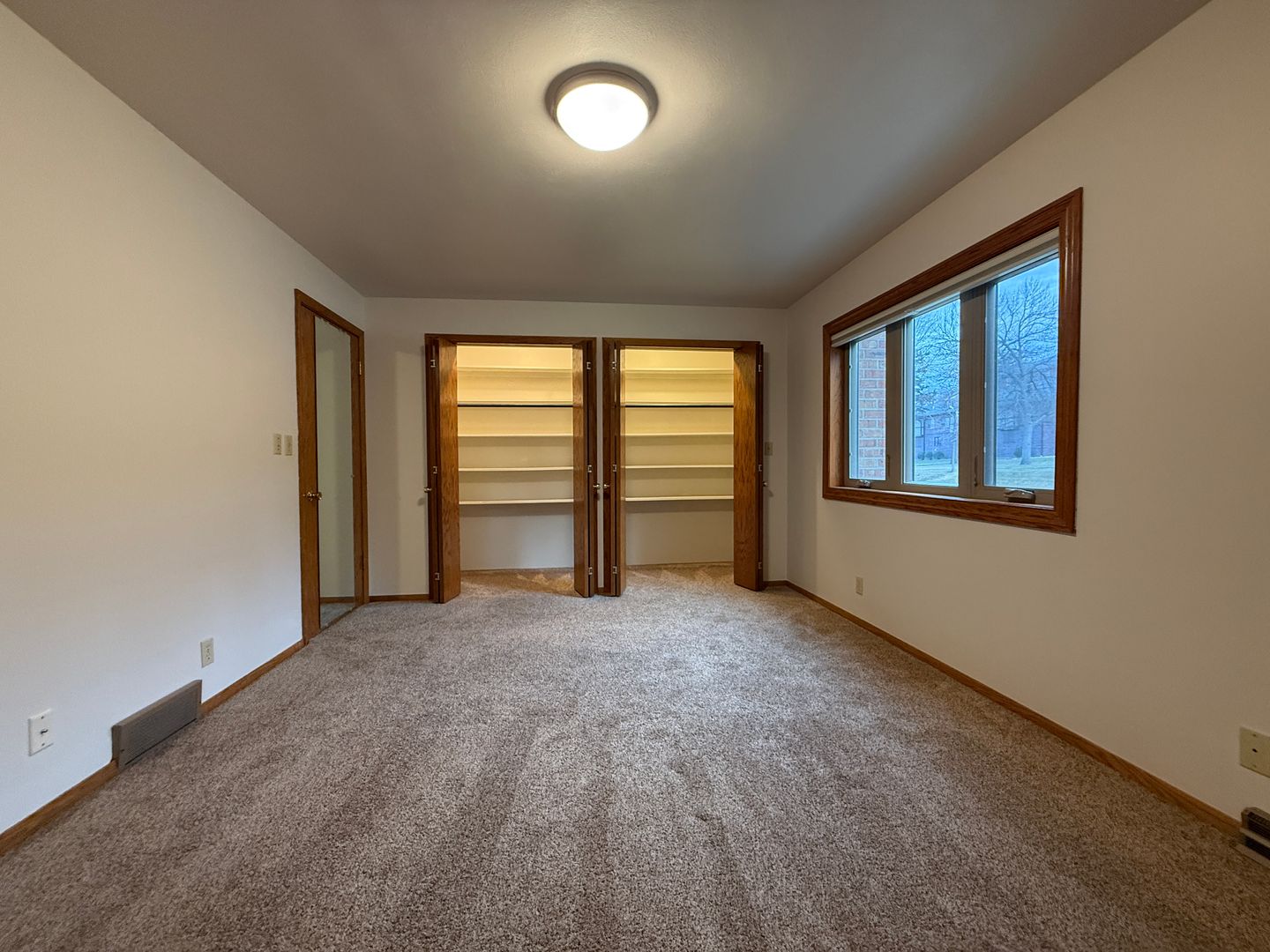 The generous living area features plush carpeting, neutral tones, and a wide window facing south and west that brings in natural light while maintaining privacy—perfect for relaxing or entertaining.