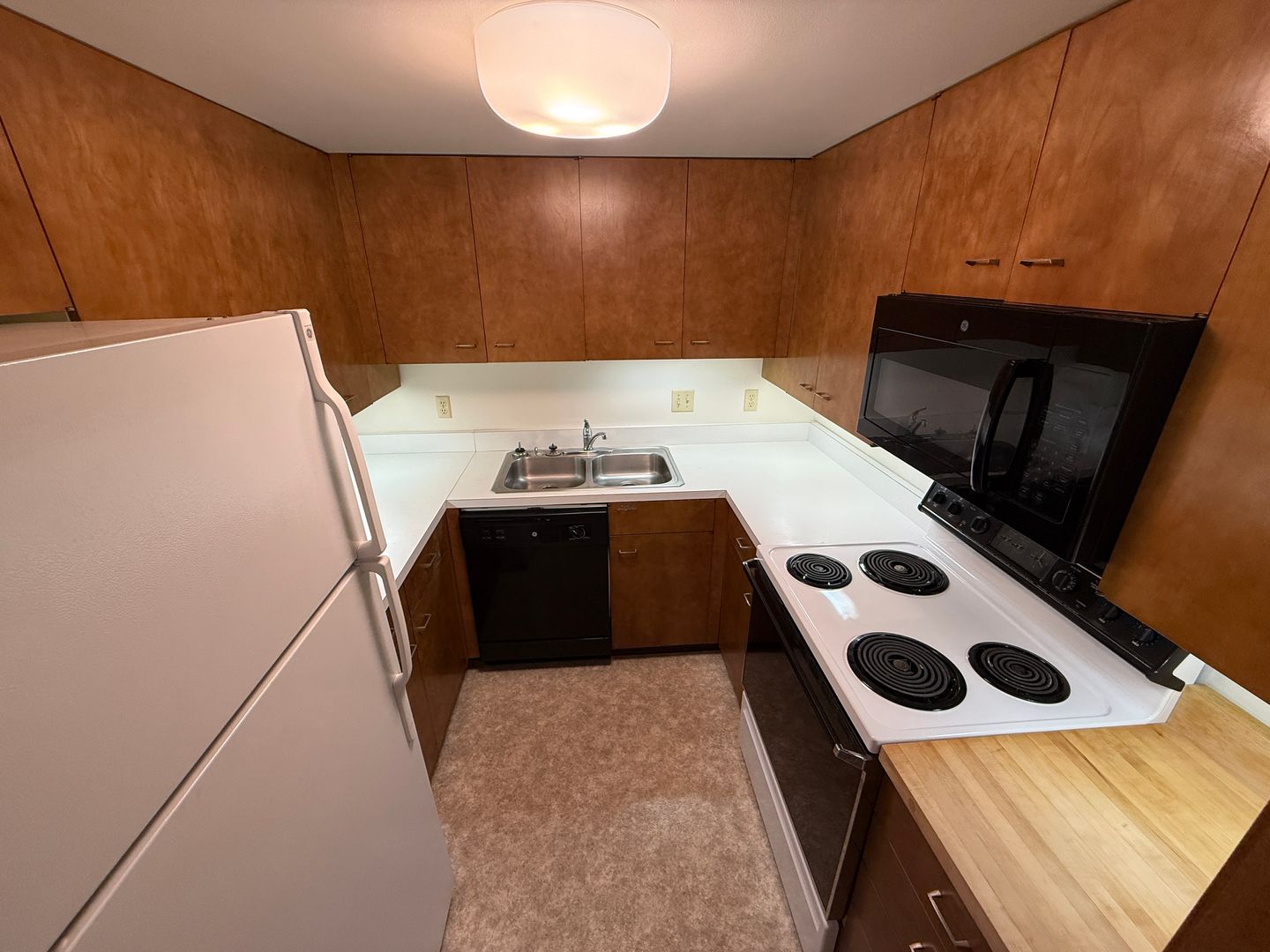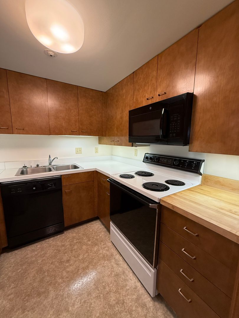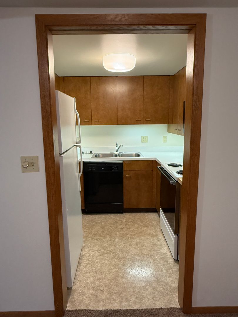 The kitchen is clean, efficient, and thoughtfully updated, offering ample cabinet storage, generous counter space, and classic appliances, including a dishwasher and full-size refrigerator.
