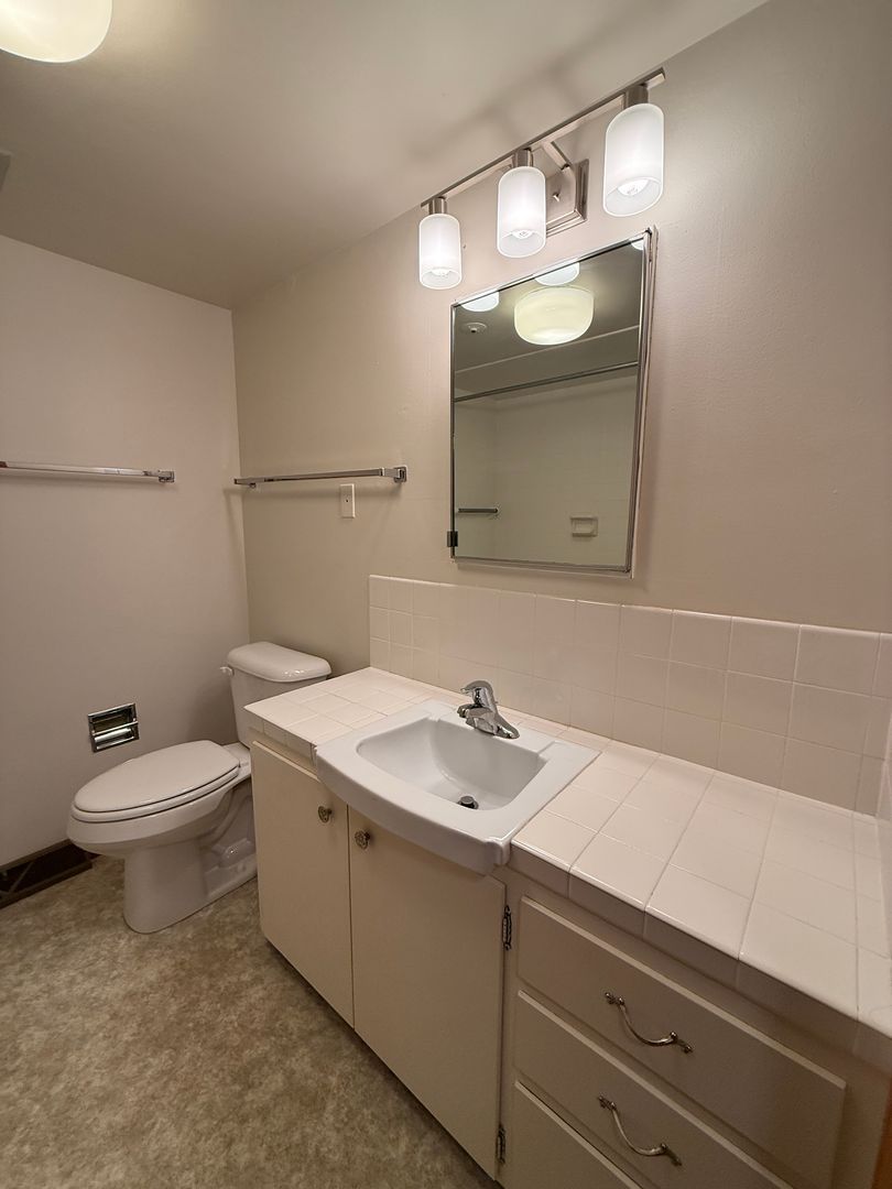 The bathroom is impeccably maintained and retro-charming, featuring tile finishes, abundant storage, and updated lighting that adds both warmth and functionality.